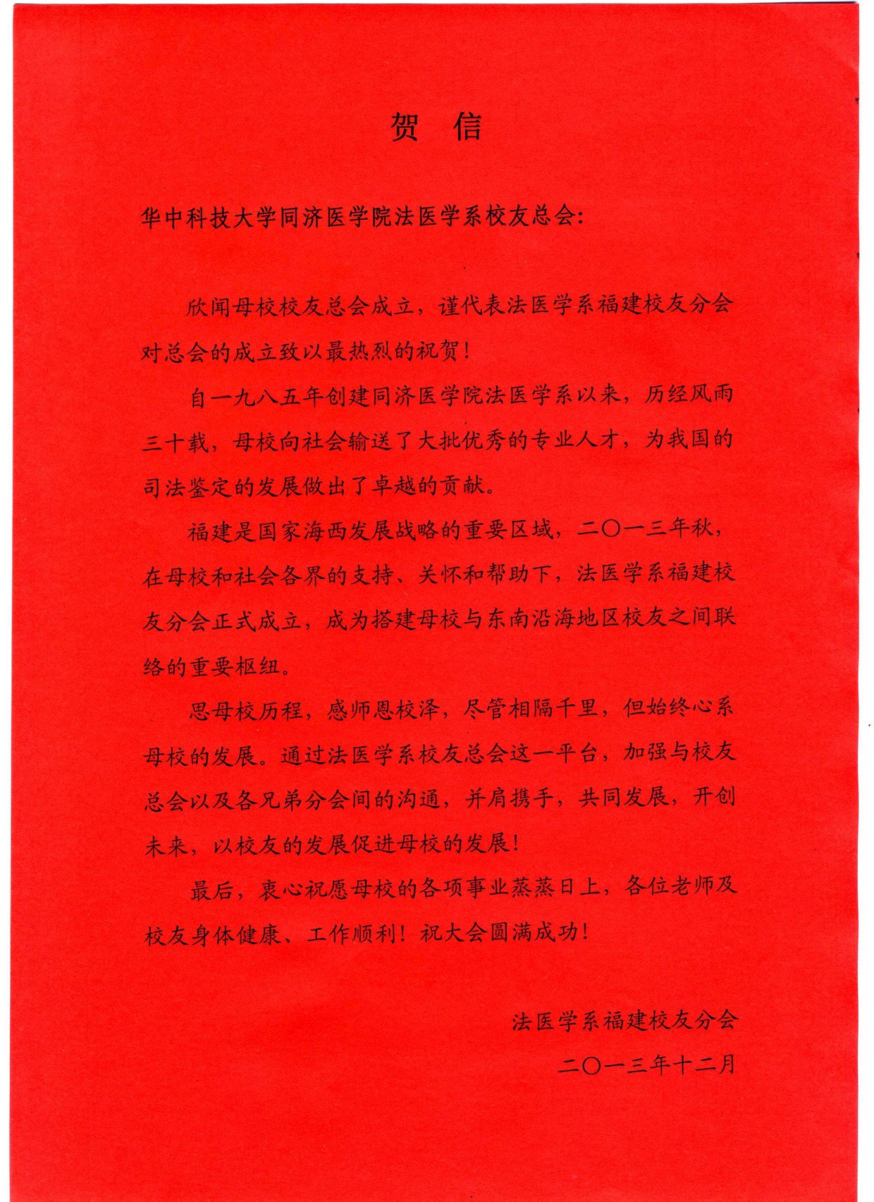 法医学系福建校友分会贺信