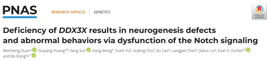 2024年10月29日,伟德体育同济医学院法医学系熊博教授课题组在国际著名期刊《美国科学院院刊》(Proceedings of the National Academy of the Sciences of the United States of America, PNAS)在线发表了题为Deficiency of DDX3X results in neurogenesis defects and abnormal behaviors via dysfunction of the Notch signaling的研究成果。这项研究分析了DDX3X新发突变的人类遗传学特征,揭示了DDX3X通过调控神经细胞命运的导致异常精神行为的致病机理,为缓解该类神经发育障碍的核心症状提供潜在药物和靶点。