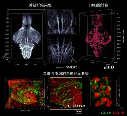 在脑科学领域,针对神经系统疾病的机制和治疗研究离不开对大脑结构和功能的深入了解。对全脑进行整体成像能够帮助研究者从宏观尺度探究不同生理和病理状态下的大脑结构与功能差异。通过物理化学方法,在保留组织和蛋白质结构的前提下,让生物组织变得透明,从而实现荧光3D成像,是目前最为直接有效的技术手段。然而,由于受到多种因素的干扰,组织透明化后的免疫荧光染色仍是领域内的难点问题之一。