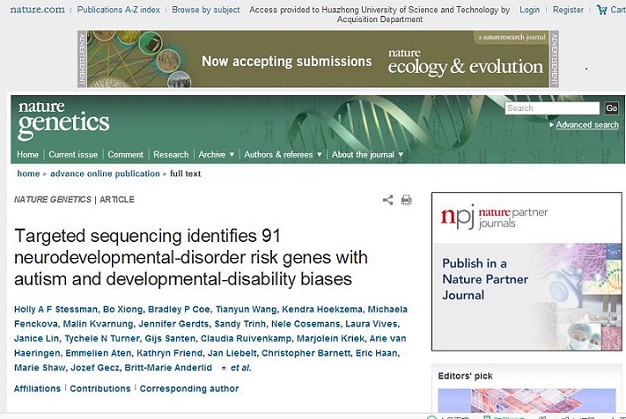 2月13日,《自然·遗传学》(Nature Genetics)杂志(最新影响因子:31.6)在线发表了题为“Targeted sequencing identifies 91 neurodevelopmental-disorder risk genes with autism and developmental-disability biases”的研究论文,我校法医学系熊博教授为论文的共同第一作者,伟德体育同济医学院法医学系和脑研究所为论文的第二完成单位。
