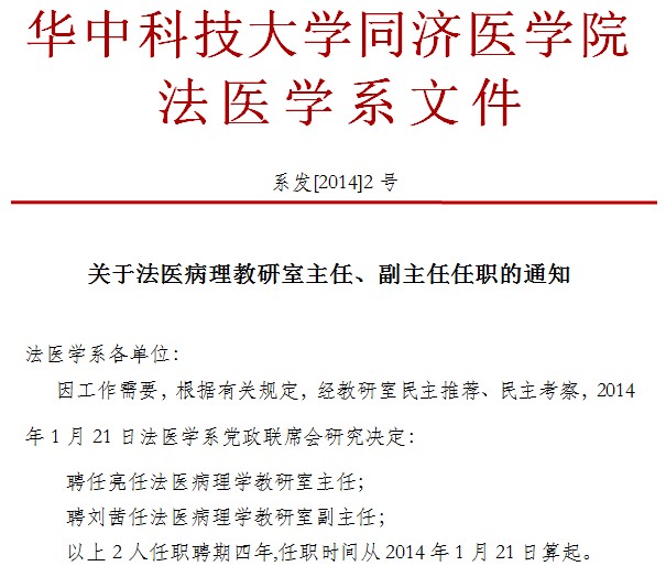 关于法医病理教研室主任、副主任任职的通知
