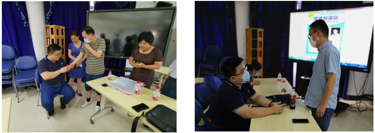 在简短的介绍后,许凯副教授首先为大家系统分析了肩关节痛病因、肩周炎疾病年龄分布情况,讲解了肩关节痛类型、鉴别与诊治。同济医院骨科闻君治疗师结合临床多年的经验演示并带领大家实践了肩周炎的常见康复疗法。同济医院骨科谈晶护士长和刘萍护士带领大家学做了爬墙运动、双肩内收外展运动等多种肩周炎自我康复训练操。他们建议大家养成好的习惯,同时日常多做操,这样来有效预防、缓解和治疗肩周炎。