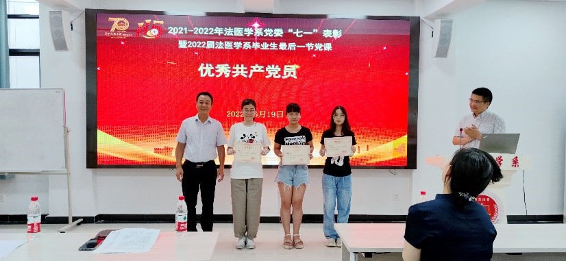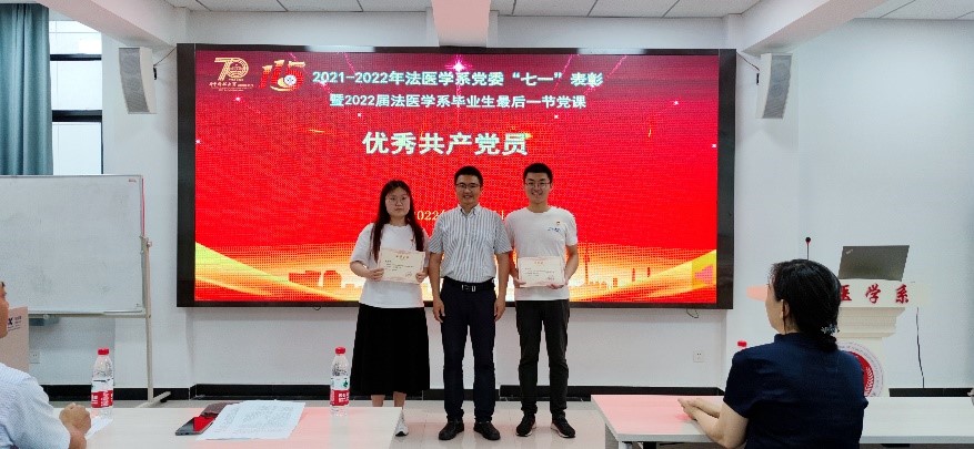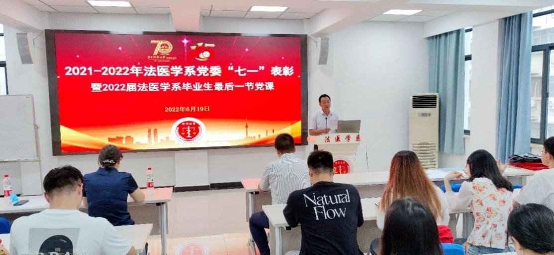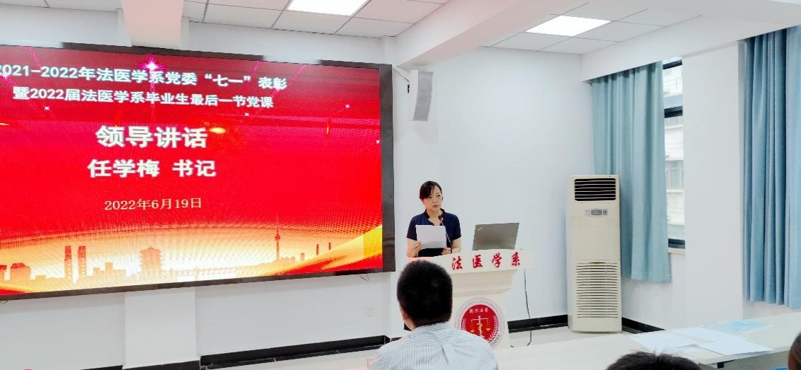 6月19日下午,在中国共产党101岁生日来临之际,法医学系党委隆重举行了“七一”表彰暨2022届法医学系毕业生最后一堂党课。法医学系党委书记任学梅、系主任黄代新参加并讲话,法医学系2022届全体毕业生党员和其他年级研究生、本科生党员及入党积极分子参加大会。大会由系党委副书记韩仁锋主持。