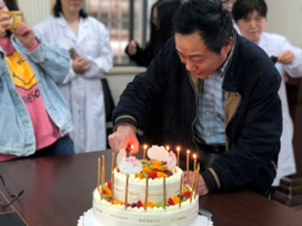 装点着新鲜水果的双层蛋糕插上了18根蜡烛,代表了祝各位女教工“永远美丽、永远年轻、永远18岁”的美好祝愿。法医学系主任黄代新亲自点燃蜡烛,并代表系领导班子向全体女教职工送上节日的问候和祝福,对大家为法医学系的发展做出的贡献表示感谢,也希望各位女同志能永葆青春,继续发扬巾帼精神,以更加饱满的热情和精神状态积极投身到系部各项工作之中。