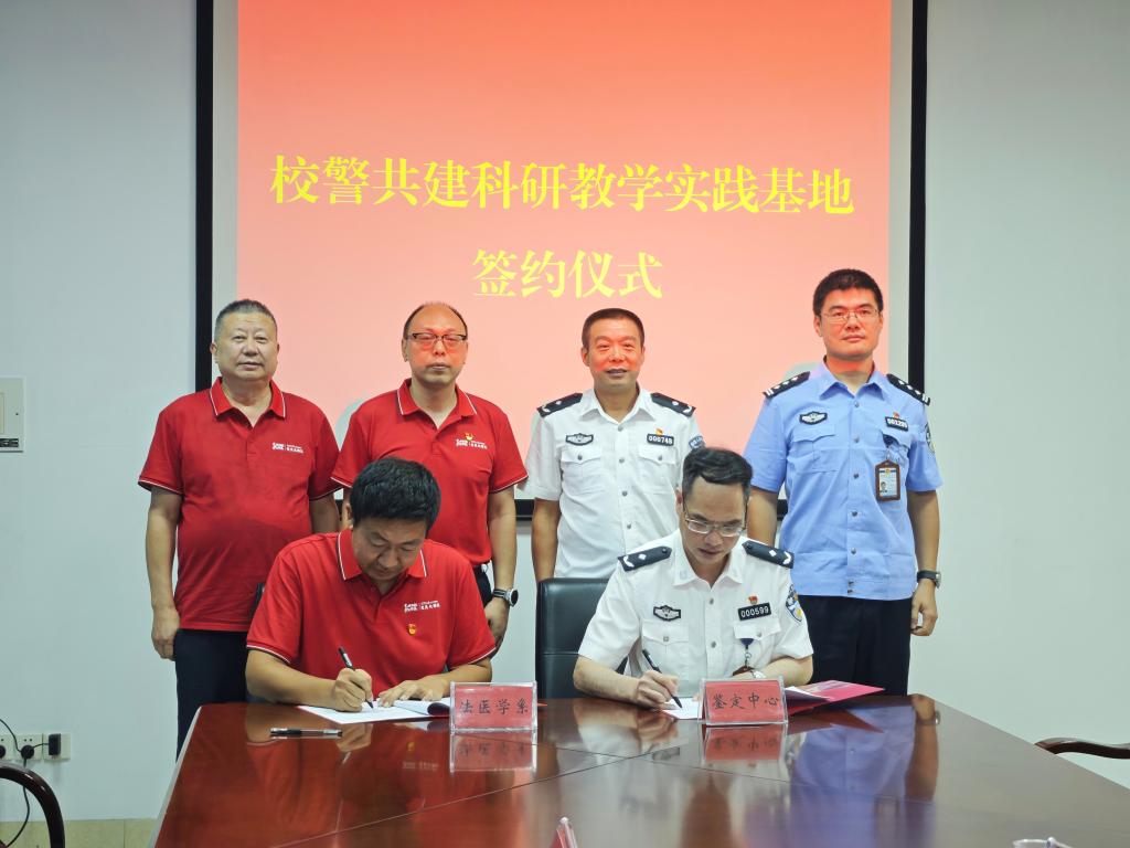 8月4日上午,法医学系与福建省公安厅鉴定中心举行了签约仪式。法医学系党委书记李剑如、系主任熊博、教授刘良等一行9人与鉴定中心主任周安居、政委黄建春、副主任卓荦一行13人参与。签约仪式上,李剑如书记与周安居主任充分肯定了以党建工作为纽带、以专业赋能谋发展、以服务实战为目标的校警共建、共赢、共享的合作理念,达成政治理论联学、专业人才联培、科研平台联建、专业导师联动、司法鉴定联合的“五联”合作协议。熊博主任与周安居主任签订校警共建协议,李剑如书记授牌党旗领航法医学教育实践基地。黄建春政委带领党员先锋队参观了公安厅鉴定中心实验室。