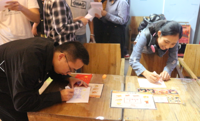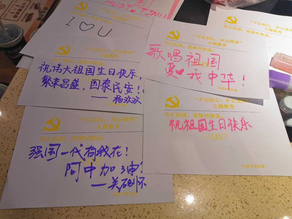 电影结束后,伴随着《我和我的祖国》这支动人的旋律,法医系师生一齐高喊“我在同济医学院法医学系,祝福伟大祖国繁荣昌盛!”并纷纷在现场准备的印有“‘不忘初心,牢记使命’主题教育”字样稿纸上,写下对伟大祖国的美好祝福。