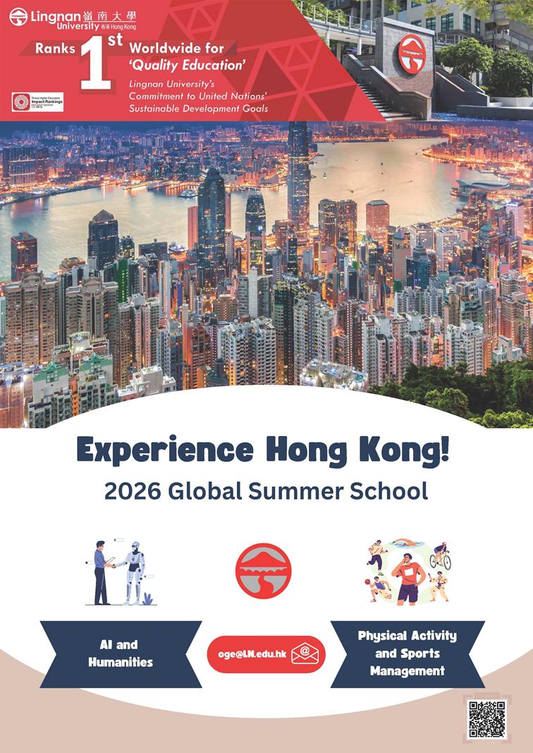 岭大推出时长1-2周的“体验香港-2026全球暑期学校”非学分项目,与学分项目区别在于,在感受香港高校跨学科前沿研究、富有活力的学术氛围、丰富校园生活的同时,也在精心设计的日程中让学生探索香港自然与人文历史遗产。课程均为上午9:30-12:30上课,下午14:00安排户外行程,配备带队人员及英文讲解。详见项目附件。可在两周课程中二选一,或者全部参加。参加两周课程、尤其是满足早鸟报名条件(1月26日前完成岭大网申)即可享有可观优惠。