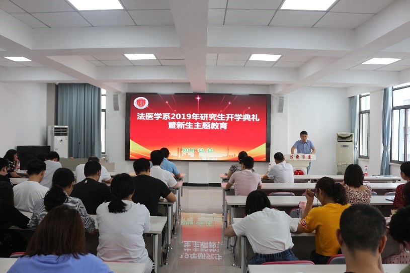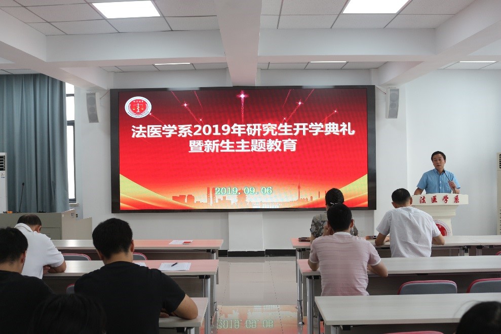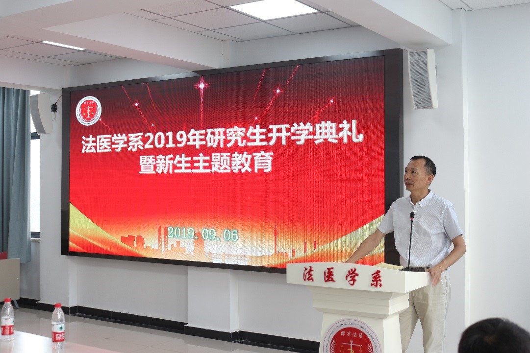 2019年9月6日下午三点,法医学系2019-2020学年秋季学期研究生开学典礼暨新生入学教育活动在法医学系七楼会议室顺利举行,本次教育活动的主题是“不忘初心担使命,献礼建国七十年”,法医学系党委书记任学梅、系主任黄代新、副主任周亦武、各教研室主任、导师代表和全体研究生参加了本次典礼。党委副书记齐海波主持了活动。