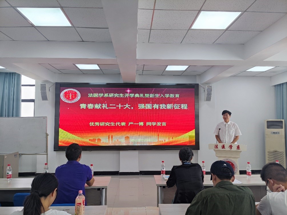 严一博同学作为优秀研究生代表发言,他曾获得研究生国家奖学金、裘法祖奖学金等,多次在国内外学术会议做报告。这是他在同济法医的第十个春秋,他首先欢迎新生来到法医大家庭,建议从研一就要树立明确目标,认真落实学校的研究生培养规划,及时和老师沟通,平衡好科研和生活。