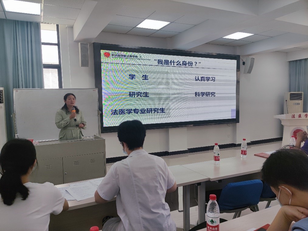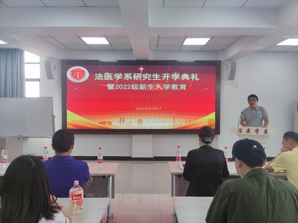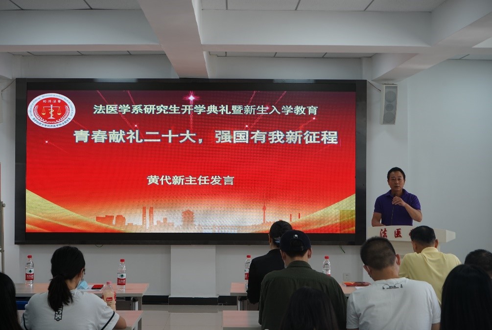 在这个充满收获与希望的季节,法医学系迎来了新一届研究生同学们。2022年9月6日上午,法医学系2022-2023学年研究生开学典礼暨新生入学教育活动于法医学系七楼多媒体教室举行。此次活动以“青春献礼二十大,强国有我新征程”为主题,法医学系党委书记任学梅、系主任黄代新、副主任周亦武、工会主席易少华、病理教研室主任任亮、副主任刘茜、办公室主任刘艳、辅导员夏述旭以及全体研究生参加了典礼,活动由系党委副书记韩仁锋主持。
