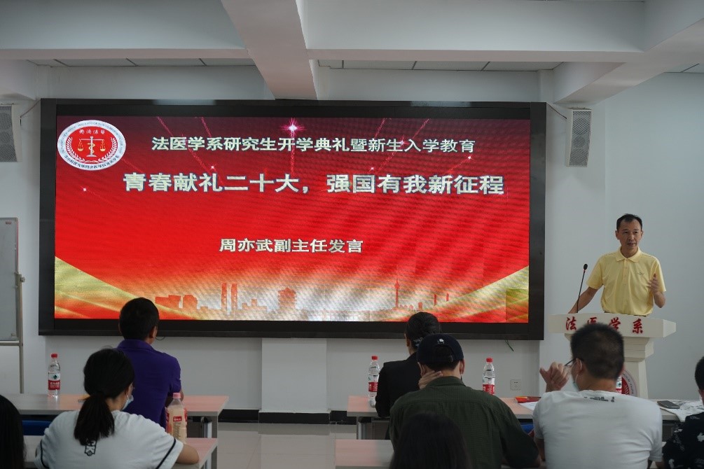 周亦武副主任的讲话内容强调学风建设教育,号召大家学习科学家精神。他勉励同学们努力学习、潜心科研、严谨检案,形成良好学风和诚信科研,他结合自身多年的教学、科研以及检案的宝贵经验,向大家传授求学生涯师生之间的相处智慧,欢迎各位同学和他一起探讨学习科研内容。周教授最后向同学们提出建议:要树立远大学习目标,在同一起跑线时后天努力更重要,努力成为一名优秀的法医人。