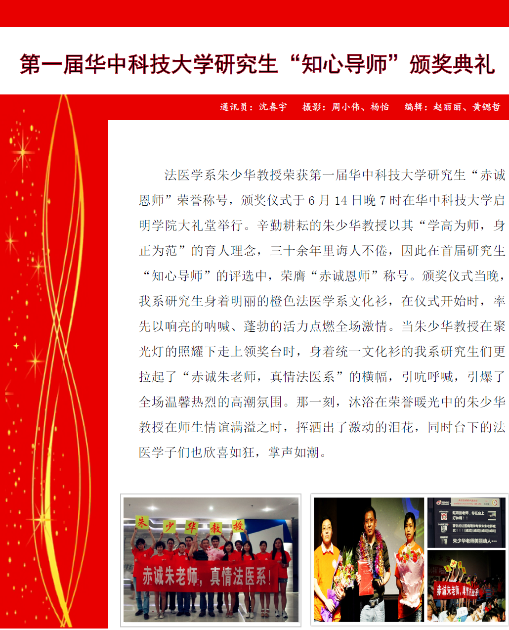 热烈祝贺我系朱少华教授荣获首届研究生“赤诚恩师”称号