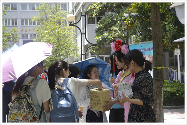 5月10日中午,学子苑内人声鼎沸,花天锦地,突然几位身着古装的佳人如同天女下凡,出现在同学们的视线里。大气庄重的汉服,精致典雅的格格,时髦优雅的旗袍,朴素青春的民国校服,“罗衣何飘摇,轻裾随风远”,花开正茂,阳光正好,她们漫步在主干道上,成为一道独特的靓丽风景,引来许多同学驻足围观。