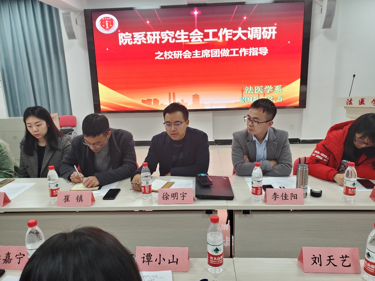 据悉,本次活动是校研究生会调研全校研究生会的一个分会。全校按照学科门类,分为文科组、理科组、医科组、工科1组、工科2组、经管组6个调研组,每个调研组由校研究生会1--2名主席团成员带队,每个调研组选定一个院系调研,该组其他院系研究生会主席加入该学科调研组。法医学系作为医科调研代表,协助完成了全部调研议程和内容。校研究生会办公室联络人将负责整理相关问题,整理后发送至被调研院系。