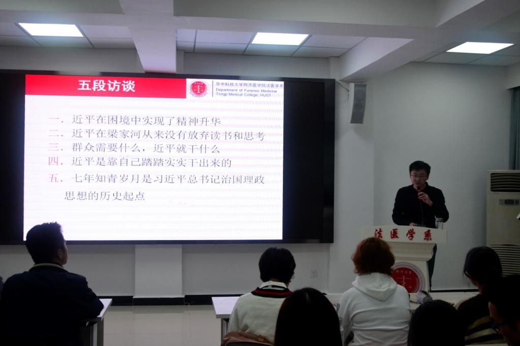 为落实学校党委要求,迎接党的十九大胜利召开,切实开展“读一本书、上一堂课”主题教育活动,10月11日晚,法医学系七楼教室内,党总支副书记齐海波与全系研究生、2013级本科生同读《习近平的七年知青岁月》,共同找寻青春答案。思政课督导组沈新民和方为民老师到堂听课。