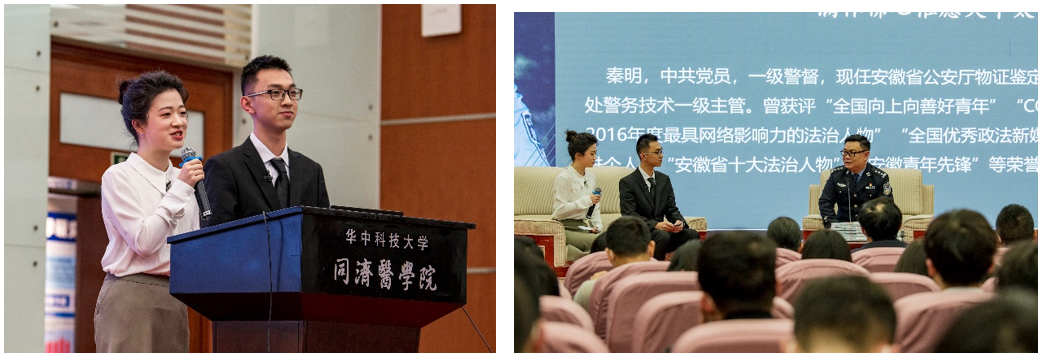 同济医学院副院长胡华成,校学生工作部副部长兼医学学生工作办公室主任、公共卫生学院党委书记陈秋生,公共卫生学院党委副书记冯霞应邀出席报告会。法医学系领导任学梅、周亦武、韩仁锋与全体法医学系师生也参加了当晚的活动。
