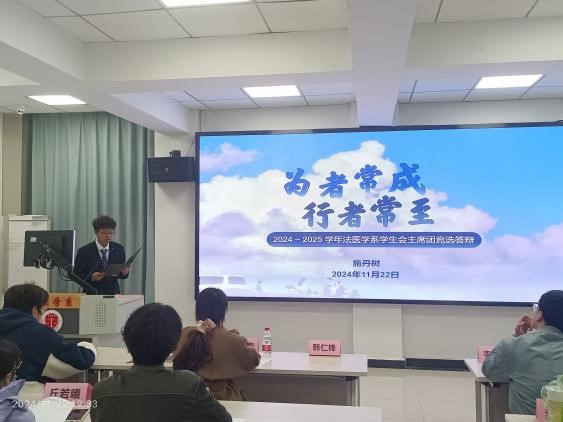 2024年11月22日晚上,伟德体育同济医学院法医学系第七次学生代表大会在法医学系七楼会议室举行。会议系统回顾了2023年换届以来学生会主要工作,选举出新一届主席团成员,顺利完成各项预定议程。法医学系党委副书记韩仁锋,校学生会(医科)指导老师李永波、法医学系团委书记李珣珣、校学生会主席团成员何雅姿、第一临床学院学生会主席团成员朱正宇和法医学系第七次学生代表大会代表们参加会议,2023届学生会主席团成员刘涵铭主持会议。