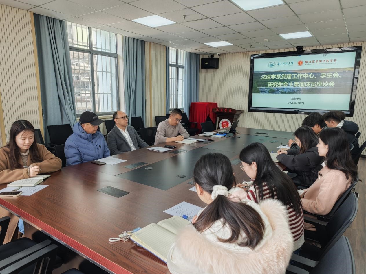 为深入学习贯彻习近平新时代中国特色社会主义思想和学校第五次党代会精神,进一步加强学生组织建设,激发学生干部的责任心和服务意识,共同推动学生工作高质量发展,2025年3月,法医学系分别召开新学期学生干部党团班建设座谈会和学生组织负责人座谈会。系党委书记李剑如与学生干部代表亲切交流指导,辅导员孙清、李珣珣、刘红海参会。会议由党委副书记韩仁锋主持。