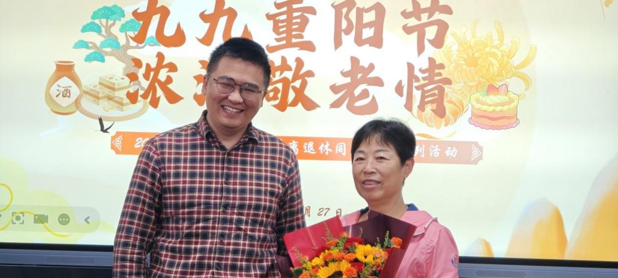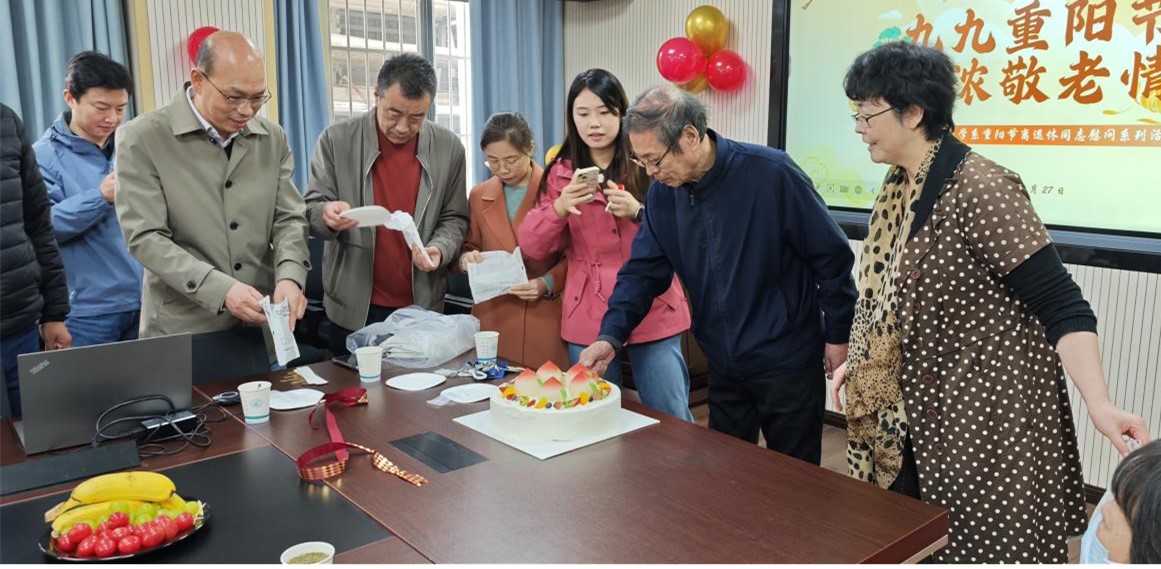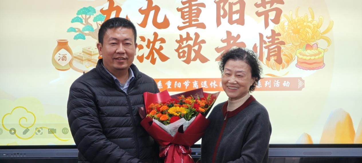 致辞结束后,温馨的庆生环节拉开帷幕。系领导为迎来秩年生日的退休老师献上鲜花,相机快门定格了师生团聚的温情瞬间。