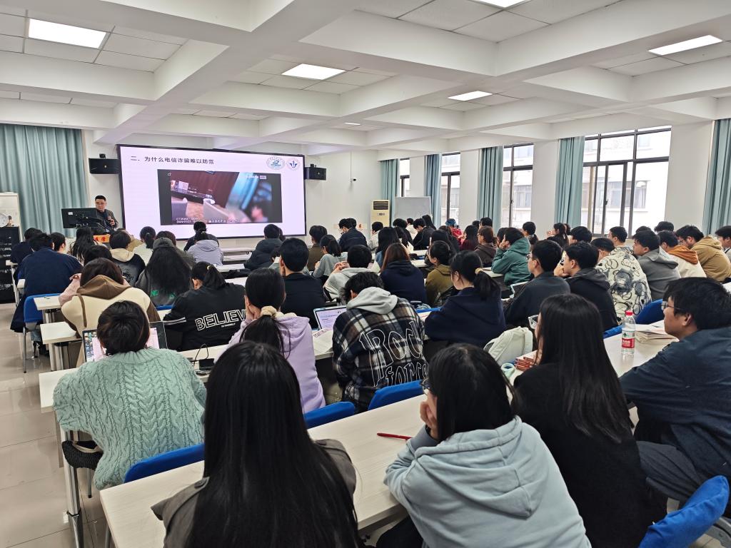 张杰老师以“提升安全防范意识,携手共建平安校园”为主题授课。反诈骗环节,他结合案例讲解电信网络诈骗识别方法与手段,传授“四个凡是”防诈口诀,凡是陌生链接不点击、凡是陌生来电不轻信、凡是涉及转账多核实、凡是验证码不透露,并普及国家反诈中心APP与“96110”预警专线使用方法。消防安全教育中,他强调“防范胜于救灾,责任重于泰山”理念,详解“小火快救、大火快跑”的处置策略和灭火器使用及火场逃生方法。