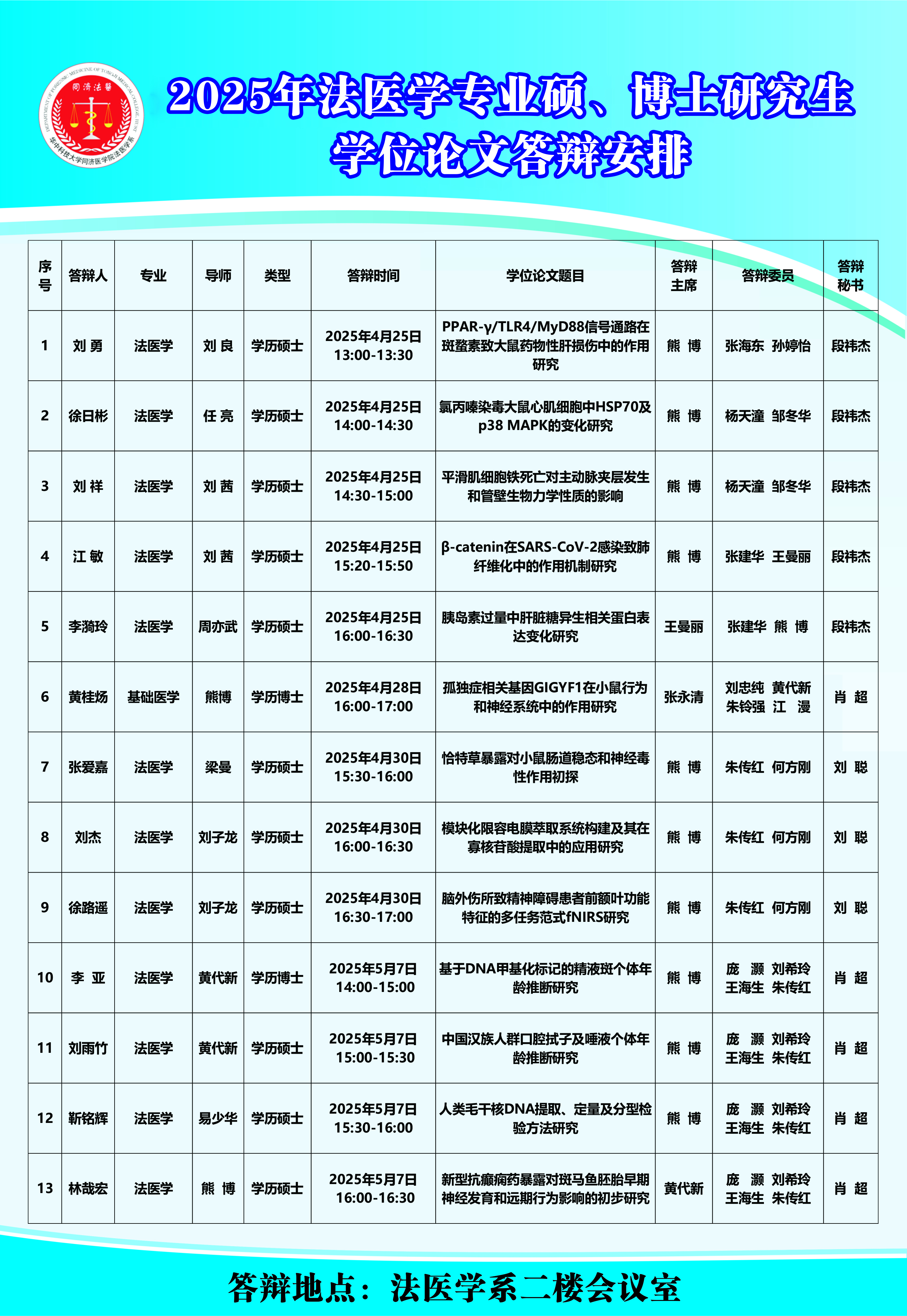 地址:湖北省武汉市硚口区航空路13号,同济医学院法医学系103室